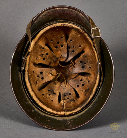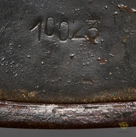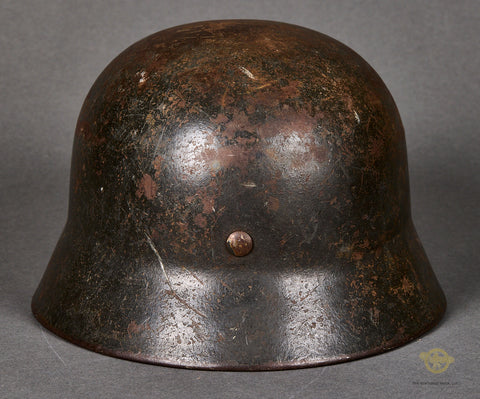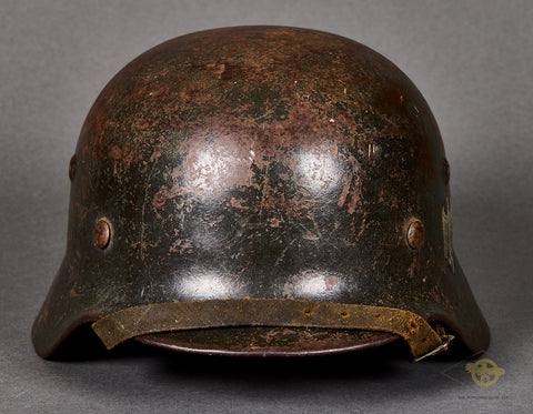 WWII German Army Model 1940 Single Decal Combat Helmet-This untouched example has a dark field gray combat finish that remains 60% or so intact. The left side has an army decal that checks in at 75% intact. The brown leather, size 57 liner is very soft, with some wear and discoloration from age and use. There is a zinc liner band and a drawstring. The side of the interior is stamped SE 64 indicating production by Sachsische Emaillerwerke in the size of 64. The rear skirt is stamped with the lot number 10025. There is a brown leather chinstrap that is in fine condition. An untouched, used but not abused example!
