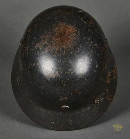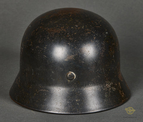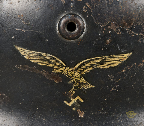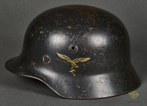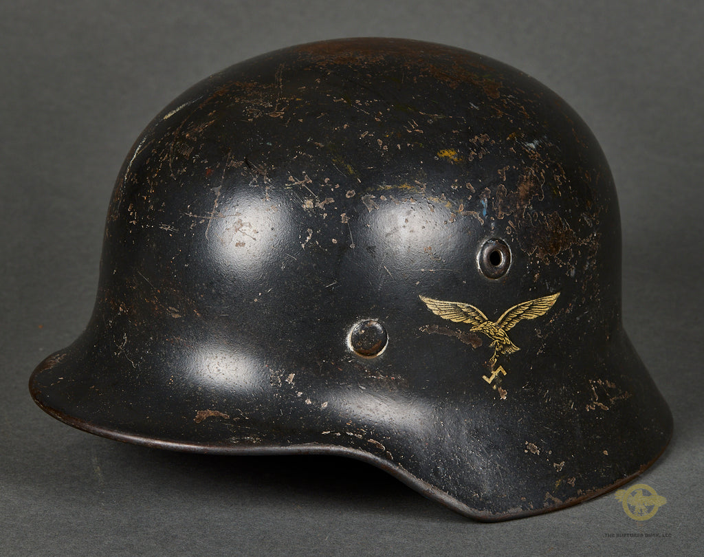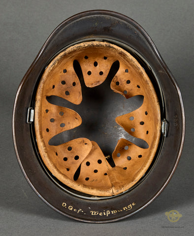 WWII German Luftwaffe Model 1935 Reissue Single Decal Combat Helmet, Named-This example has a blue gray parade finish that remains mostly intact. This example started life as a parade helmet with two decals but was reissued for use during the war and is now a single decal example. The Luftwaffe decal is in very good condition, lightly toned and checking in at 80% intact. Inside is a brown leather liner that remains very soft and supple but does show some minor wear, scuffing and discoloration. There is a drawstring and a zinc liner band. It is size stamped 56. The side of the interior is stamped Q 64, indicating production by Quist in the size of 64. The rear skirt is stamped with the lot number DN 221. The soldier wrote his name and rank on the rear skirt as well, O.Gfr.Weißwange. An overall very good example!