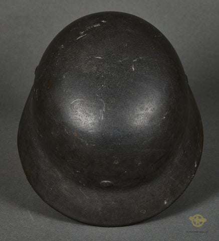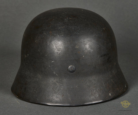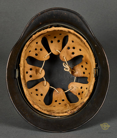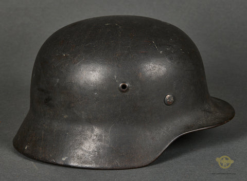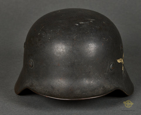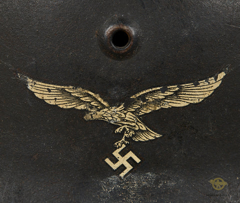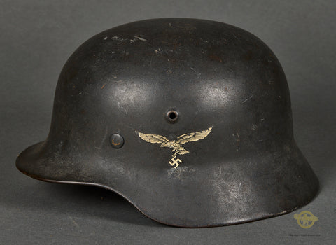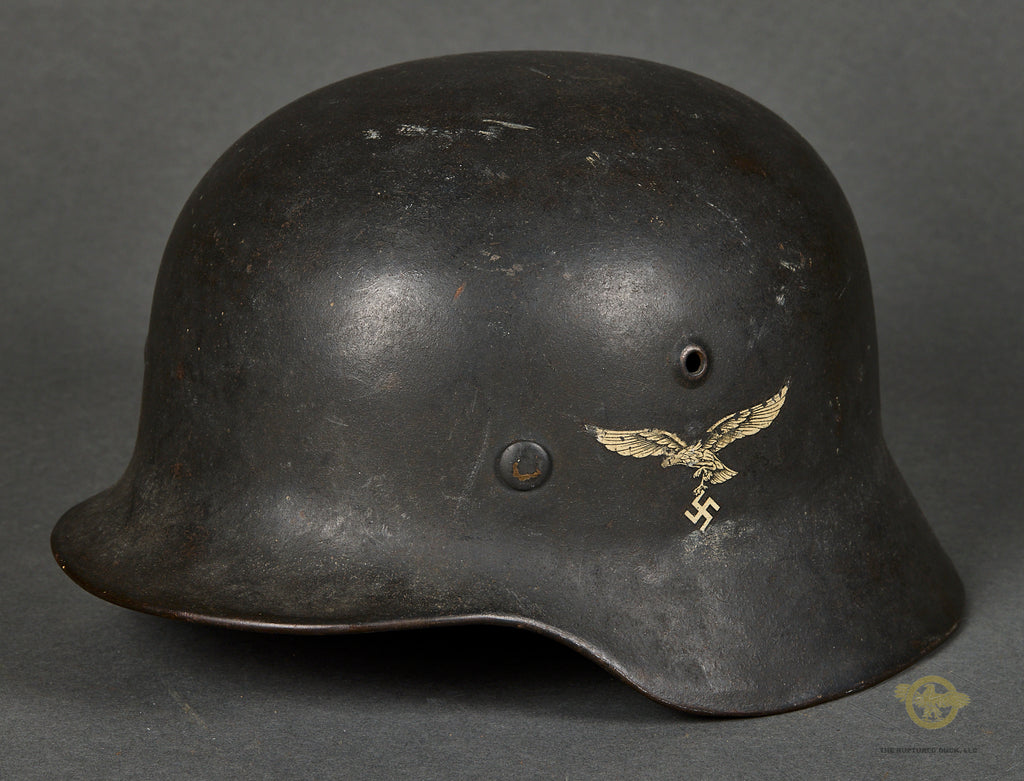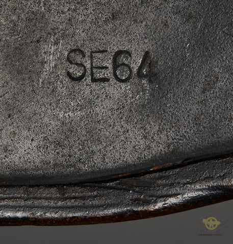 WWII German Luftwaffe Model 1940 Single Decal Combat Helmet-This example has a blue gray combat finish that remains 85% intact overall. The Luftwaffe decal is a very nice example, checking in at 85% intact. Inside is a brown leather liner that remains very soft and supple but does show some minor wear, scuffing and discoloration. There is a drawstring and a zinc liner band. It is size stamped 57. The side of the interior is stamped SE 64, indicating production by Sachsische Emaillerwerke in the size of 64. The rear skirt is stamped with the lot number 10396. An overall very good example!