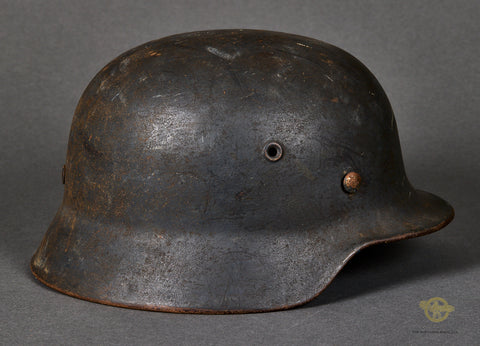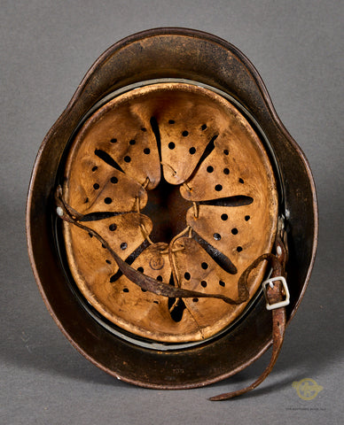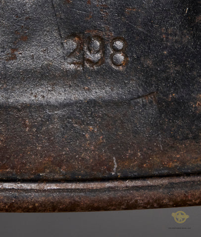 WWII German Luftwaffe Model 1940 Single Decal Helmet-This handsome lid has a blue grey combat finish that remains 85% intact overall. The Luftwaffe decal on the left side checks in at 80%. Inside, the size stamped 57 leather liner has some minor wear and discoloration but remains quite soft and supple. There is a zinc liner band and a drawstring. The side of the interior is stamped ET 64 indicating production by Eisenhuttenwerke in the size of 64. The rear skirt is stamped with the lot number 298. There is a brown leather chinstrap as well. It is quite worn and has shrunk a bit but it is original. A near excellent example!