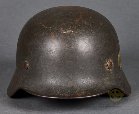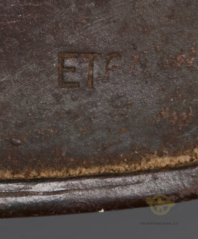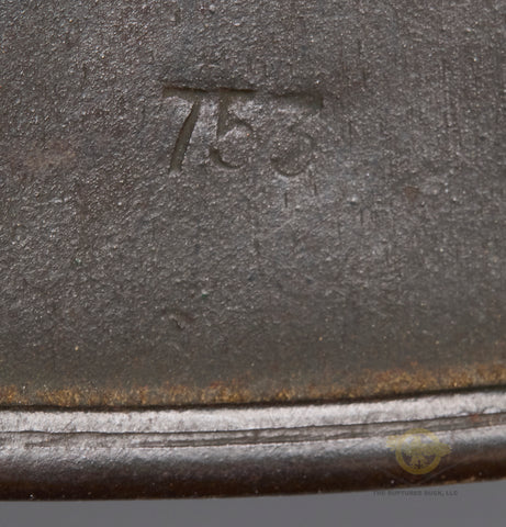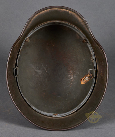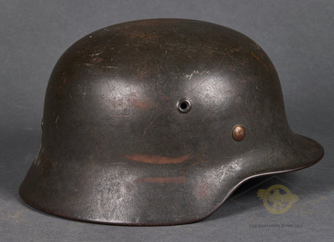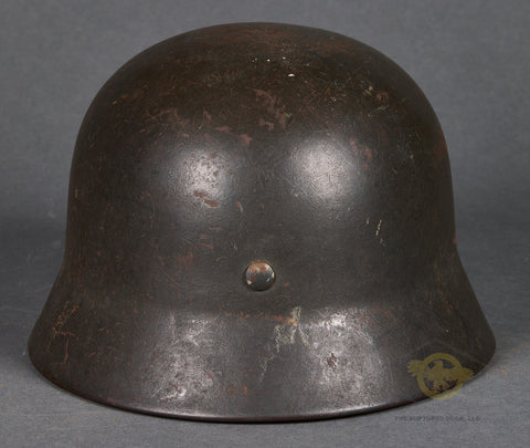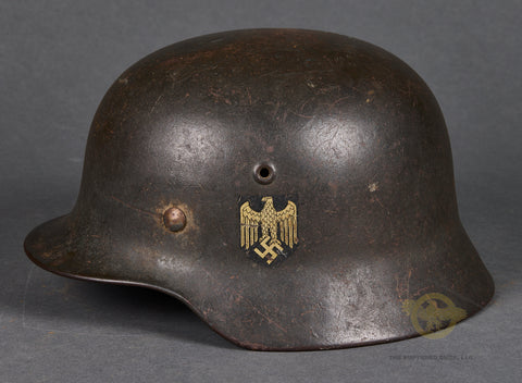 WWII German Model 1940 Army Single Decal Helmet-This example retains 85% of its original field grey combat finish. The lightly toned army decal checks in at 90%. There is a zinc liner band but the liner itself is missing. There is a dome stamp. The side of the interior is stamped ET 64 indicating production by Eisenhuttenwerke of Thale in the size of 64. The rear skirt is stamped with the lot number 753 indicating production some time in 1941. There is a single chunk of the original chinstrap as well. A sound display example!