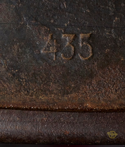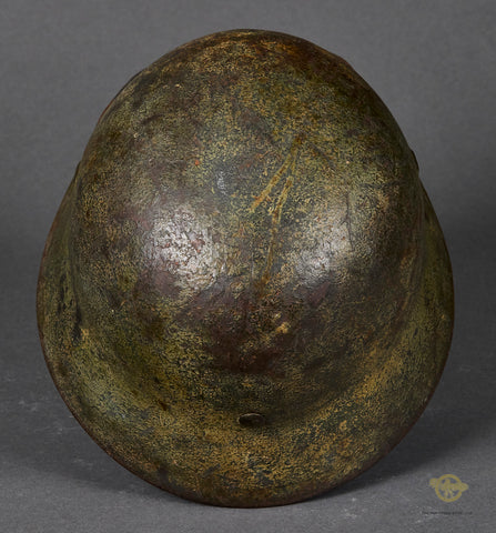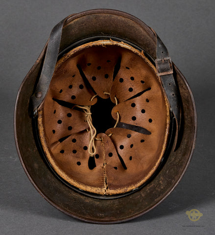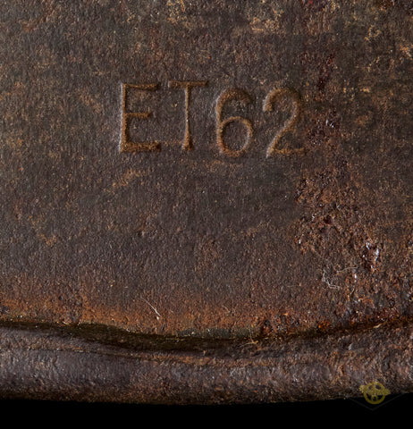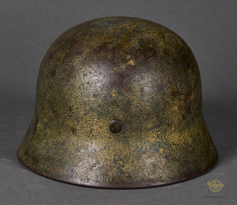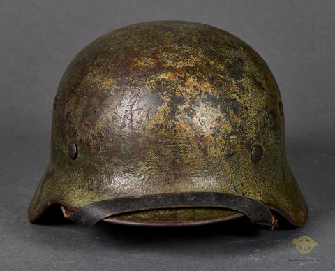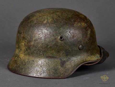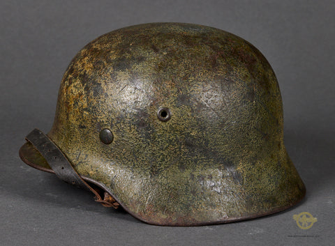WWII German Model 1940 Wehrmacht Camouflage Helmet-This has a thick textured camouflage finish of green and yellow (Normandy?) that remains 75% intact. The interior features a brown leather, size stamped 57 liner that is in very good condition, having just minor wear, discoloration and scuffing. There is a drawstring and a zinc liner band that is maker marked, dated 1943 and size stamped. The liner has been replaced at some point as the rivets are not camouflaged and the date is later as this was made some time in 1941 according to the lot number of 435. The side of the interior is stamped ET 62 indicating production by Eisenhuttenwerke of Thale in the size of 62. The chinstrap is included as it is a post war example. A good example overall!