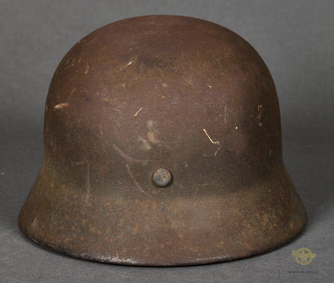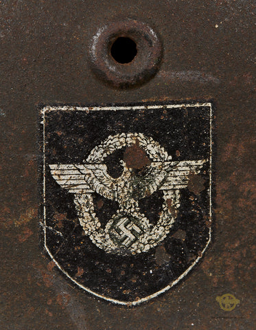 WWII German Police Model 1940 Double Decal Helmet, Veteran Family Acquired-We acquired this helmet from the family of the veteran who brought it home. We will supply the name and info on the vet to the purchaser of this helmet. This combat example has a field grey finish that has wear and remains about 25% intact. The left side has a bordered police decal that is 75% intact. The right side has a party shield that is 80% intact. Inside is a size stamped 56, brown leather liner that has minor wear, discoloration and scuffing from use. There is a zinc liner band that is maker marked, dated 1943 and size stamped 64/56. The rear skirt is stamped Q 64 indicating production by Quist in the size of 64. The rear skirt is also stamped with the lot number DN 37 S. A very good example overall!