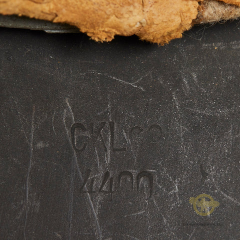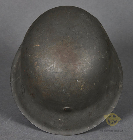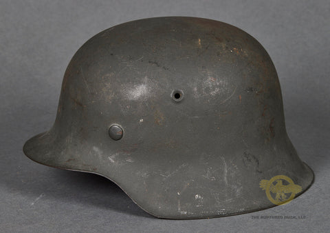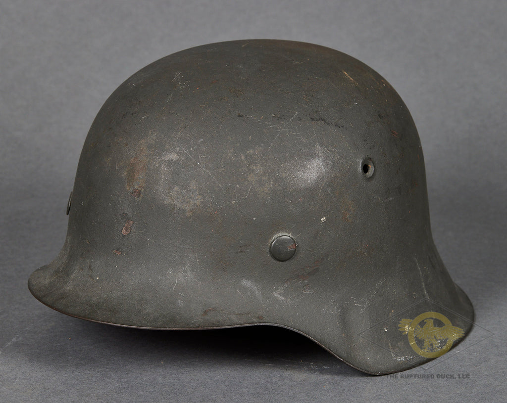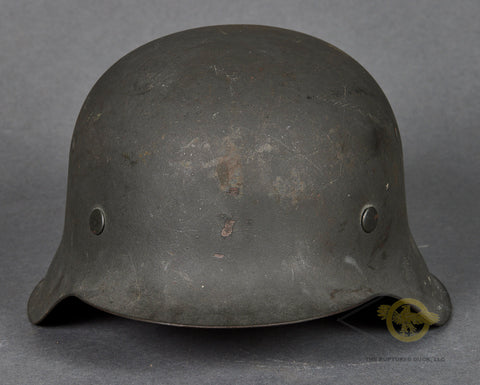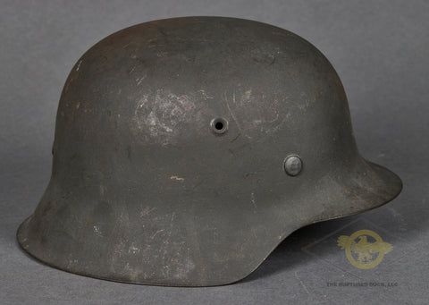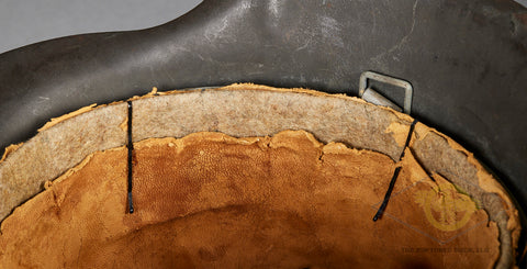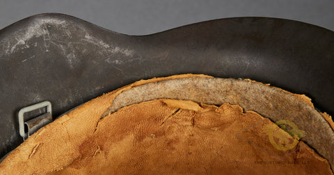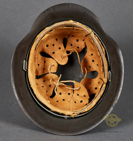 WWII German Wehrmacht Combat Helmet-This example has nearly 100% of its original rough texture, field grey combat finish intact. It is quite choice! Inside, the size stamped 54 liner is very rough, with tears and scuffing but remaining clean. There is a zinc liner band and a drawstring. The rear skirt is stamped ckl 62 indicating production by Eisenhuttenwerke in the size of 62. The rear skirt is also stamped with the lot number 4420 which is a very late production of 1944. A very clean, untouched example!