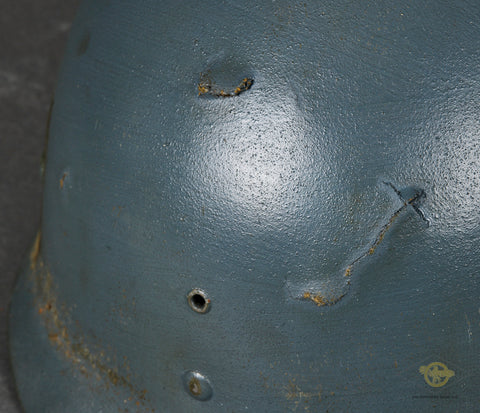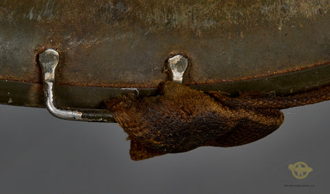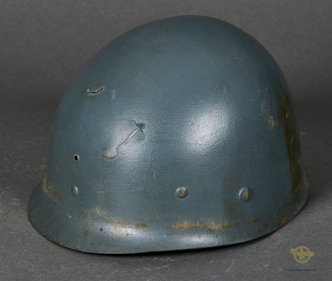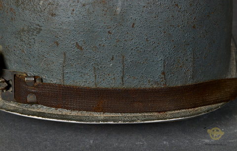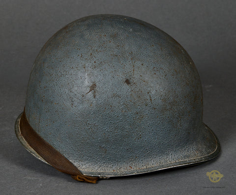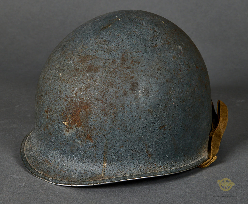 WWII US M1 Helmet for use by Navy Personnel-This is a scarce and desirable navy example with a shipboard gray finish on both the shell and the liner. The shell does have some stress cracks. The finish is mostly intact. It is a front seam, fixed bale example. The olive drab chinstrap is worn and dirty and it has steel hardware. The interior is the original greenish gray finish. The Firestone liner has the same gray finish. It has a few small nicks and a few small cracks. There is heavy wear and discoloration to the interior but it is all there. That is except for the chinstrap which is only partially intact. A desirable example!