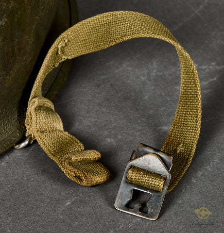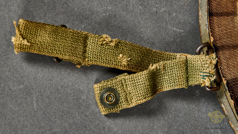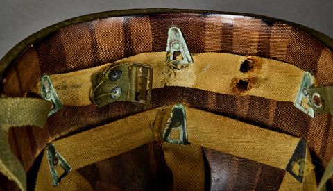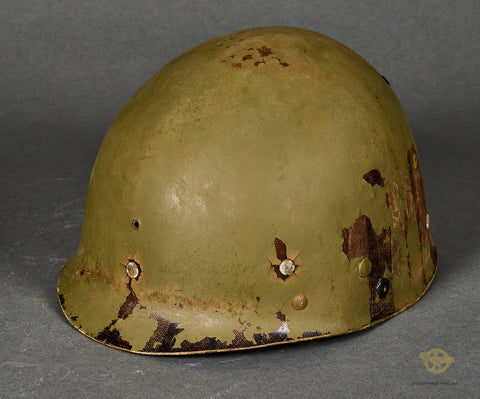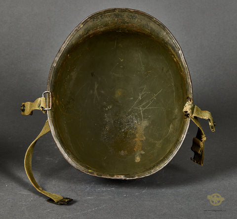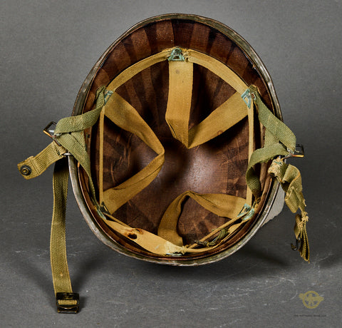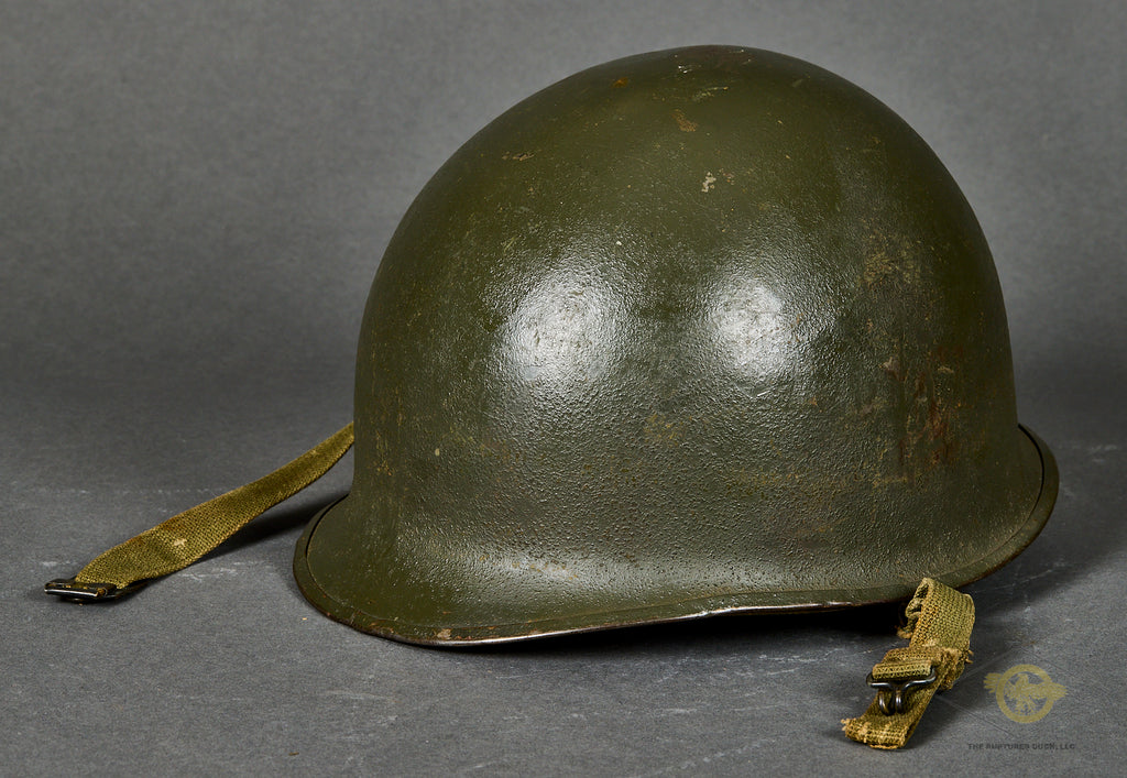 WWII US M1C Paratrooper Helmet-This is a front seam, swivel bale example with a post WWII repaint for use during the Korean War. Factory bar tack with reinforcement. Reattached chinstrap. WWII Firestone para rigger modified liner with factory finish to the exterior. There are remnants of a Korean War nape strap. A desirable lid fairly priced!