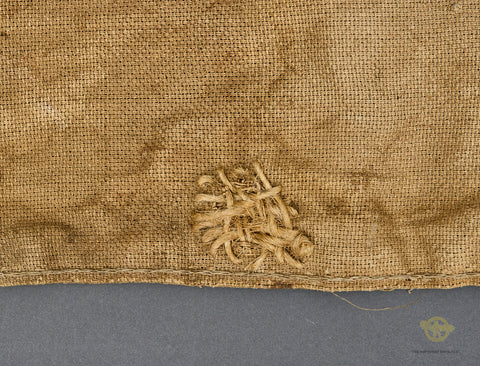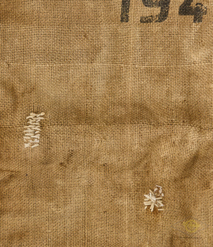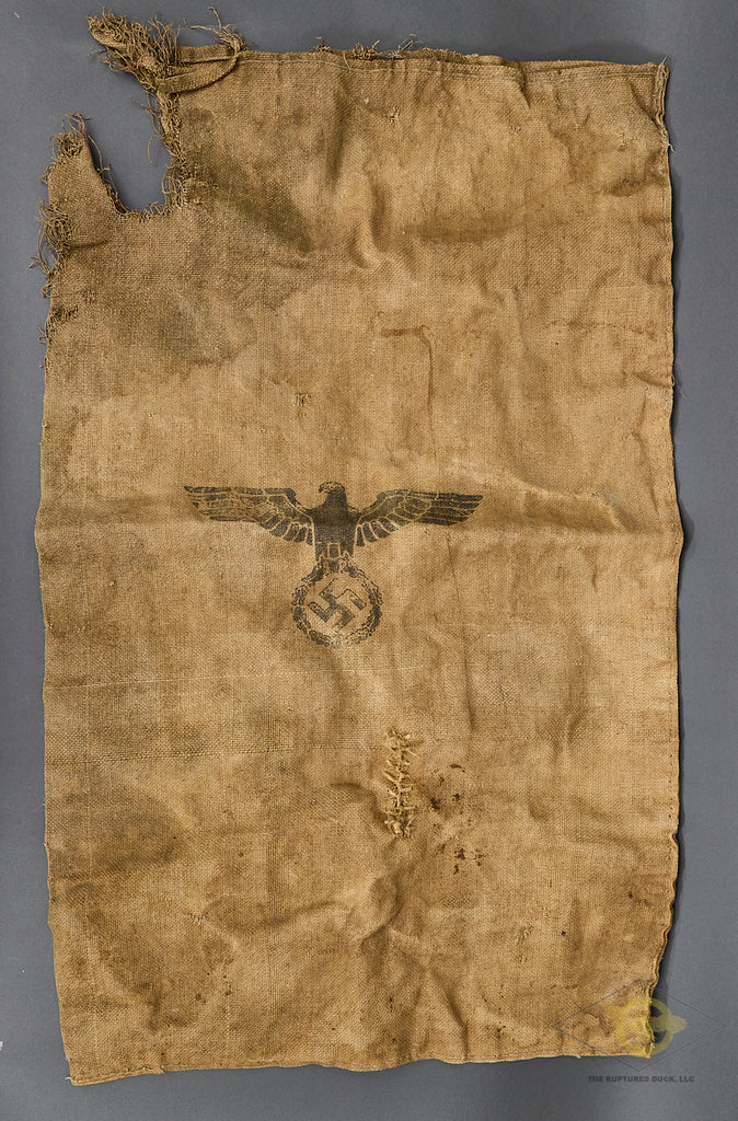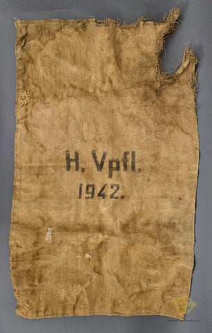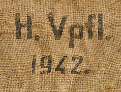 German WWII Heer Army Burlap Ration Grain Sack-This is heavy burlap sack. This is the standard issue brown burlap Heer ration grain sack, which measures approx. 43 inches (109 cm) high, and 27 ½ inches (969.85 cm) wide. A steady supply of food was of utmost importance to any fighting force, and these sacks were the preferred way of transporting grain. This bag has a large stenciled Wehrmachtadler (Armed forces eagle) on the obverse. On the reverse is a stamp with H. Vpfl. 1942. The initials are for Heeres Verpflegung, or "Army Rations". This bag is in fair condition. It has a good sized tear on top a few holes and some have repairs. An interesting collectible.