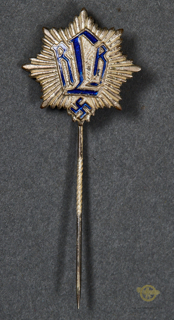 German WWII RLB Starburst Stick Pin-This is the 1st style of the iconic RLB emblem. This is an unusual style, as it is a knurled stick pin instead of a pinback. The silver and blue enamel of the RLB script is in very good condition and nicely toned. This measures 22mm in diameter. It is very nicely marked on the back for the maker Enders with Ges.Gesch. This is a very good example!