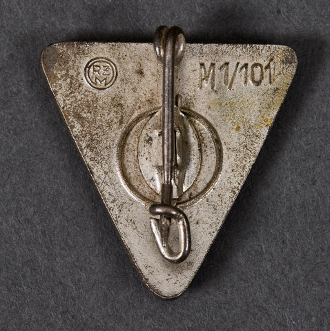 Third Reich Deutsches Frauenwerke Membership Pin-This triangular shaped membership pin was for the Women’s Association that was created in 1933. This association was the early version of the Frauenschaft. This organization served as a means to bring existing women’s organization in line with the party principles, focusing on the role of housewives, and mothers. It has a black enamel front with a sonnenrad/odalrune motif. The script at the top reads “Deutsches Frauenwerke” in red. This shows only slight wear. This badge measures 25mm by 22mm wide. This medal has a vertical pin. The reverse is RZM marked with M1/101, indicating it was produced by Gustav Brehmer. Very good condition overall!