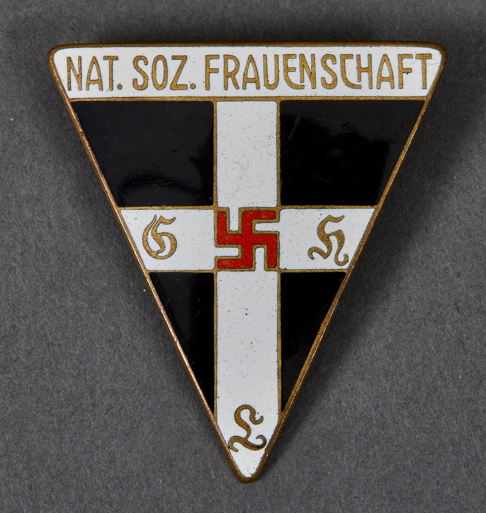 WWII German Large Size NSF Enamel Pin-This is the larger, triangular pin for National Socialist Frauenschaft (female) members. It has white, black, red and gold enamel that remains partially intact, with a repaired section. The reverse features a horizontal needle pin that functions properly. The reverse is marked with the RZM motto and the maker code 63, indicating production by Steinhauer & Luck. It is in very good condition! We have two of these and the one you receive will be as good if not better than the one in the photo.