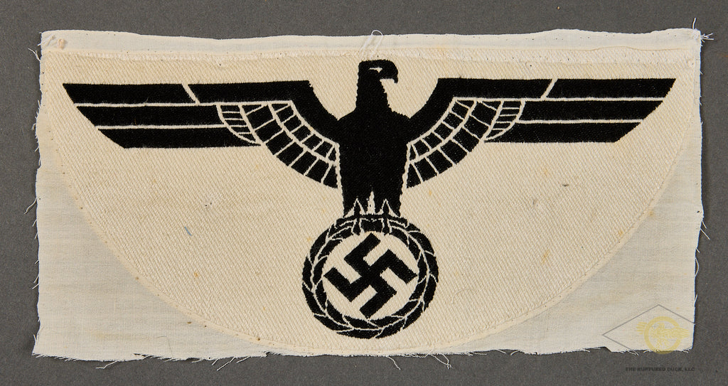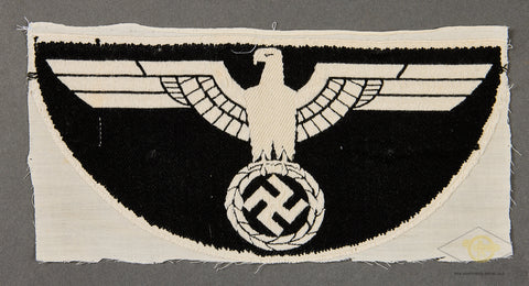 German WWII Army Athletic Shirt Eagle Insignia-This is machine woven in black over a white semicircle. It is unissued. The wingspan is 9 inches (22.86cm) in length. This is very clean. There are two pin holes just below the wings, where we assume someone had this pinned up. There is very slight fraying to the unfinished edges, but otherwise in very good condition! Great display piece!