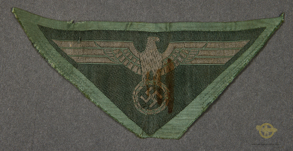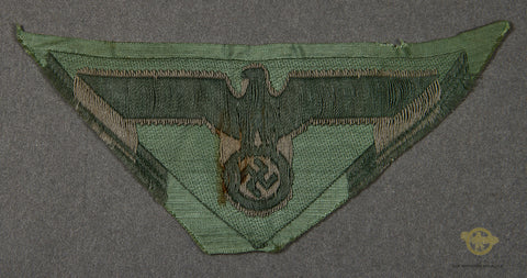 German WWII M44 Army Breast Eagle-This is an example of a late war gray BeVo material in a triangular shape. This is the last style made and was used on combat tunics such as the M44. This is made in BeVo. There is discoloration to the front, so please be sure to look closely at the photos. Overall good condition.