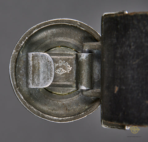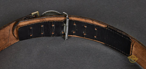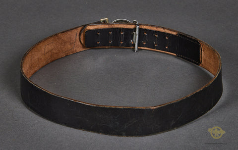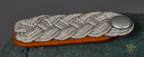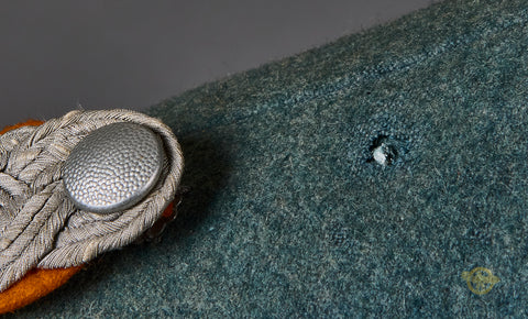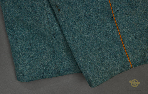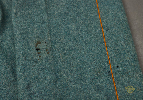 Third Reich Rural Police Officer (Gendarmerie) Tunic and Trouser Set, Former Member of the SS-This is a great set for a gendarmerie major who was formerly a member of the SS. It includes a service tunic, a pair of service trousers and a belt and buckle combo. The tunic is produced in blue green wool that has some minor wear, some discoloration and a number of very small moth bites. There are four pockets with scalloped flaps. The breast pockets are pleated. There is an 8 button closure and all buttons are silver finished pebbled metal. The collar and cuffs are chocolate brown badge cloth. The front and lower edges of the collar, the edge of the cuffs, the edges of the closure seam and the tail are all piped in orange. The collar tabs are orange badge cloth with silver bullion columns and tresse. The slip on shoulder boards are a matte grey flat wire braid over orange badge cloth. These are for the rank of major. There is a blue green patch with silver bullion SS runes indicating former SS personnel. The left sleeve has a silver bullion sleeve eagle that is in great condition. The interior is fully lined in greenish brown cotton. There is a single pocket on the left side. There are numerous markings all around, most of which are very faded and hard to read. You can clearly see the date 1941. The jacket is a size large. The straight legged trousers are produced in blue green wool that matches the tunic very nicely. They are clean with some wear and multiple moth holes, some of which are almost pencil eraser sized. They are piped down each leg in orange. There are vertical slash cut hip pockets, a single rear pocket with a scalloped flap and a watch pocket. There is a cinch strap in the rear. There is a four button fly with an additional button at the waist. The trousers are in 44” length and the waist is a size 30. The belt and buckle are a nice addition. The belt is dark brown leather. The buckle is matte gray zinc, each with minor wear. The buckle is maker marked on the back by Overhof and Cie. A very nice set overall!