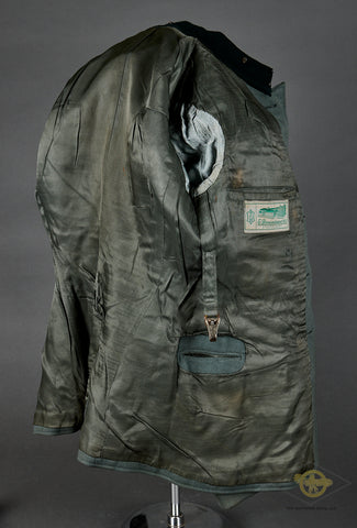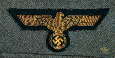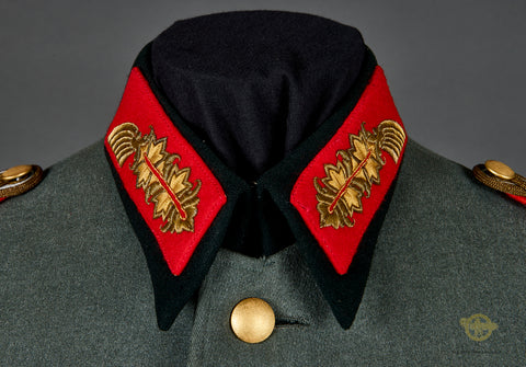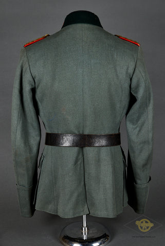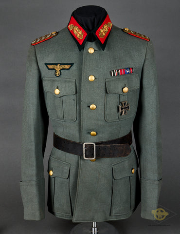 WWII German Army General Tunic and Trousers-This private purchase set is in great condition! The quality of the materials is top notch of course. The tunic is produced in a very soft field grey wool. There is very minor wear only. There is one small nip on the right breast pocket. There is a five button closure and all buttons are gilt finished pebbled metal. There are four pleated pockets with scalloped flaps. There are French cuffs and a dark green badge cloth collar. The red badge cloth collar tabs have gold bullion and flat wire general insignia. The are originally applied. The sew in shoulder boards are REAPPLIED. They are originals but have been reapplied to the tunic. Each has a gold and silver metallic braid over a red badge cloth backing. This is for a generalmajor. The breast eagle is also original but reapplied to this tunic. It is gold bullion with gold flat wire highlights over dark green wool. There are loops for a single badge on the left breast pocket plus loops for a medium ribbon bar above the pocket. These are original and not collector added. The interior is fully lined in green rayon. It shows signs of use but is in very good condition. There is a single pocket on the left side which has a large tailor tag on the outside. It was produced by a tailor in Stuttgart. There is a strap with a plated metal snap clip plus a slot for an edged weapon. The tunic is a size medium. The trousers are light grey with parallel twin red stripes down each leg. They are in very good condition with minor wear and discoloration only. There are buttoned hip pockets, a watch fob pocket and a four button fly with two additional buttons at the waist. There are cinch straps at the hips and a pair of buttoned rear pockets with scalloped flaps. There are numerous buttons inside for various items and a set of straps for suspenders. The waist is a size 36 and these are 38” in length. A nice set!