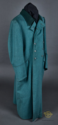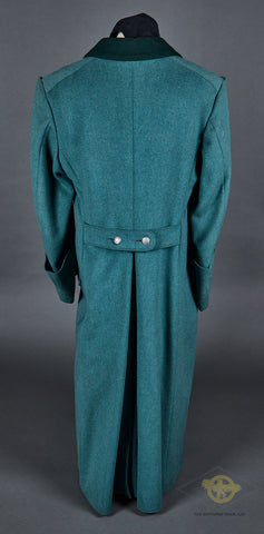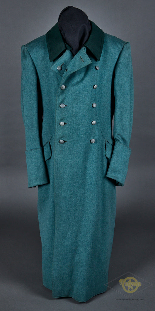WWII German Army Model 1936 Officers Great Coat-This coat is in great condition. It is produced in a very soft field gray wool that is very clean. There are a few very minor areas of discoloration only. The only issue is that the shoulder boards and buttons were removed at some point. It would be a worthwhile project to replace these with a correct set. It is double breasted with two rows of six field grey finished pebbled metal buttons. There are hip pockets with straight flaps. The interior is fully lined in a golden brown rayon that is very clean. There is a single pocket on the left side. This is a size medium. A good restoration candidate.