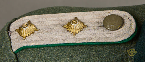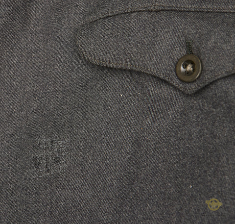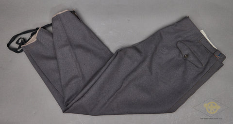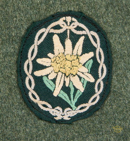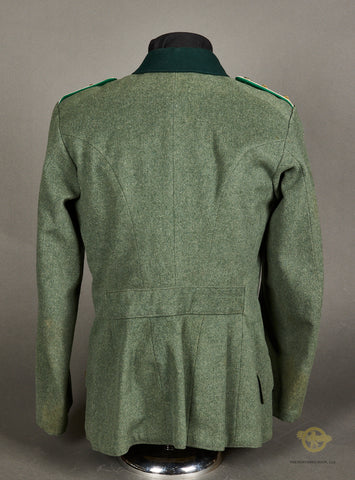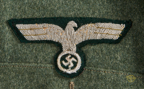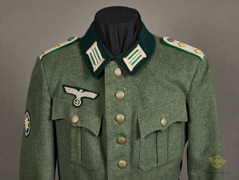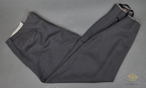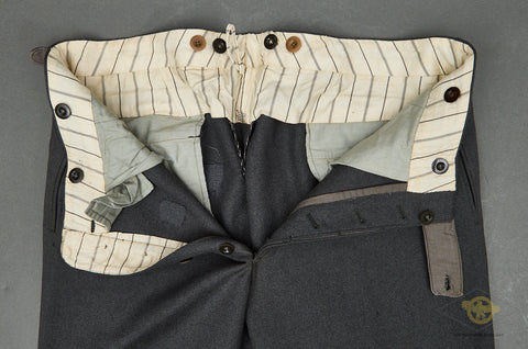WWII German Army Mountain Trooper Officer Early Tunic and Trousers-The tunic is an early example produced in field grey wool that is of a good quality. There is very minor wear, a few spots of discoloration/staining and a few moth nips. This is all very minor. There are four pockets with scalloped flaps. The breast pockets are pleated and the hip pockets are internal. There is an eight button closure and all buttons are field grey finished pebbled metal. I believe these buttons are collector reapplied. The collar is dark green badge cloth and in fine condition. There are officer style, originally applied collar tabs machine embroidered in silvery grey cloth over dark green badge cloth, each having dark green litzen. The sew in shoulder boards are also originally applied and have a matte grey flat wire face with two gold pips each over a green underlay. This is for a hauptmann or captain. There is a machine woven mountain trooper edelweiss patch on the right sleeve. The breast eagle is silver bullion with bright silver flat wire highlights over dark green cotton. It is hand applied and original to the tunic. The tunic is fully lined in grey cotton. There is minor wear and discoloration only. There are no internal pockets. It is a size medium. The trousers are grey linen. There is minor wear and discoloration with a few minor repairs as well. These are straight legged trousers with ties at the ankles. There are slash type hip pockets, a pair of rear pockets with scalloped flaps and a watch pocket. There is a four button fly with a buttoned strap at the waist. There are cinch straps at each hip. The waist is a size 36 and these are 41” in length. A very good set!
