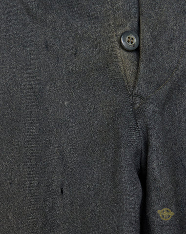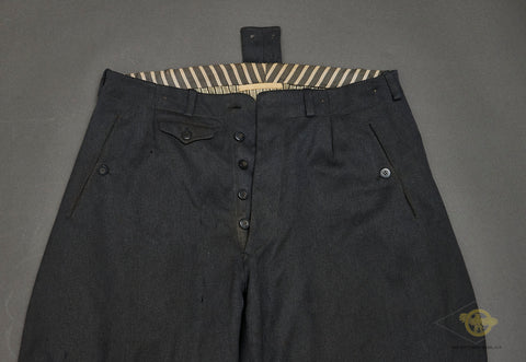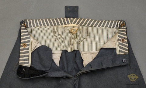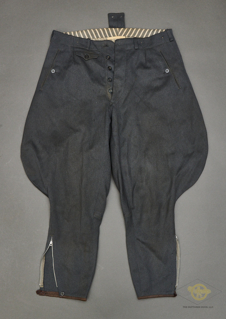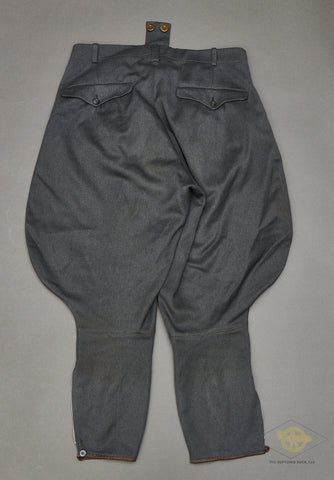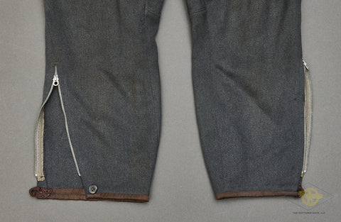 WWII German Army Officer Breeches-These are produced in slate grey wool. There is minor wear, minor discoloration as well as a few small holes. The lower legs have zippered closures with a button at the end. The zippers work as intended. There are buttoned hip pockets, a pair of rear pockets with scalloped flaps and a watch pocket. There is a four button fly with an additional button at the waist. There are buttons for suspenders. The waist is a size 33 and these are 37” in length. Overall good condition!