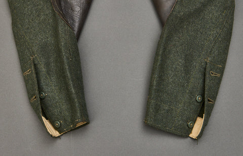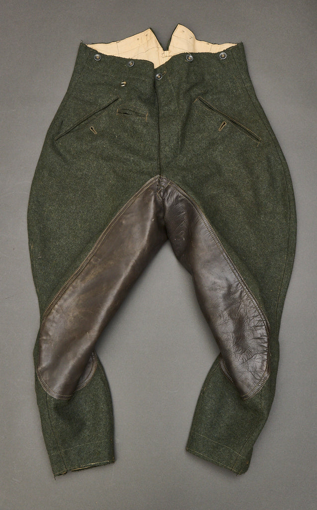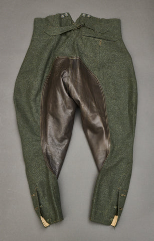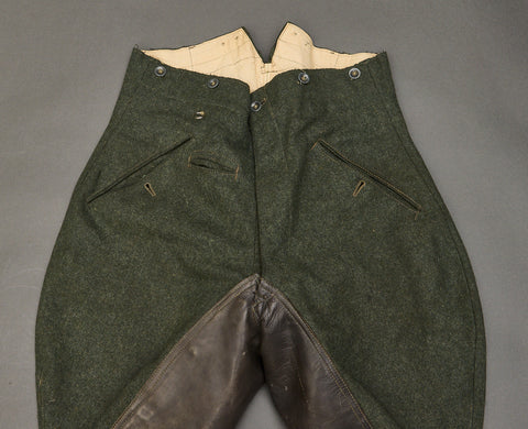 WWII German Army Riding Breeches-These are produced in field grey wool with a large grey leather patch inside the legs and around the rump. There is minor wear and minor discoloration only. The lower legs have buttoned closures. There are buttoned hip pockets, a single rear pocket and a watch pocket. There is a four button fly with an additional button at the waist. There are buttons for suspenders and a cinch strap at the rear. The interior has ink stamps that indicate the maker was Steinmeyer. There are size stamps as well as the date ’43. The waist is a size 34 and these are 38” in length. Overall great condition!