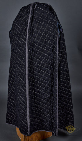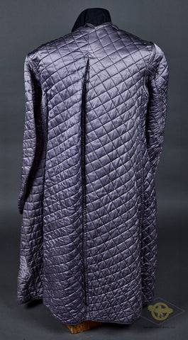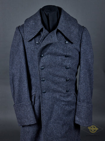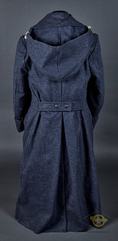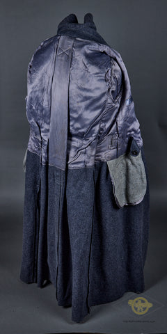 WWII German Luftwaffe Great Coat with Underlining and Hood-This late war example is produced in blue grey wool that is in excellent condition. It is double breasted, with two rows of six dark blue grey finished pebbled metal buttons. There are hip pockets and a lay down collar. The interior is partially lined in blue rayon. It has marked to include the size information, the date 1944 and an RBNr. Also included is a heavy, quilted underlining. This is marked with an RBNr and the size, II (2, medium). The attached hood is buttoned to the great coat. It is also produced in blue grey wool with a string closure. This is an excellent set with rarely encountered accessories!