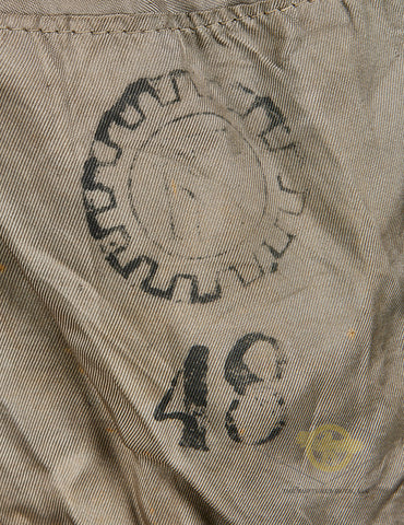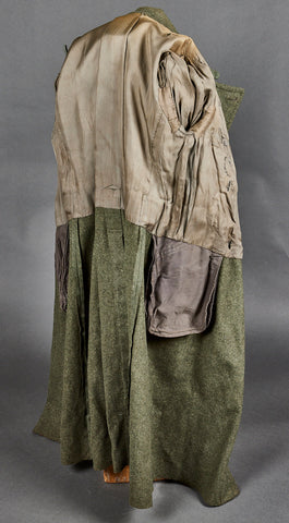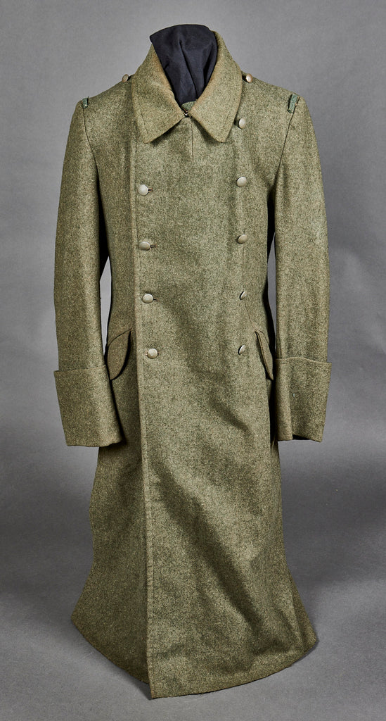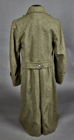 WWII German Model 1940 Army Great Coat-This is produced in field grey wool. There is minor wear, minor discoloration and a few tiny holes. It is double breasted with a pair of rows of five green finished pebbled metal buttons each. There is a lay down collar and straps/buttons for a set of slip on shoulder boards. There are hip pockets with straight closures. The interior is partially lined in green rayon. Even though this an army style, apparently at one time it was used by the DAF. There is a large DAF cogwheel ink stamped inside with other numbers as well. There is an RBNr stamped as well. It is a size medium. Near excellent overall!