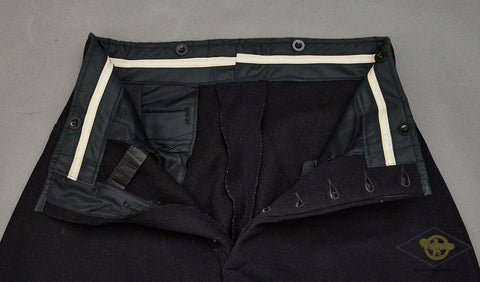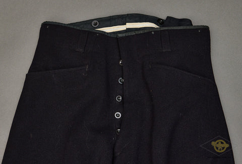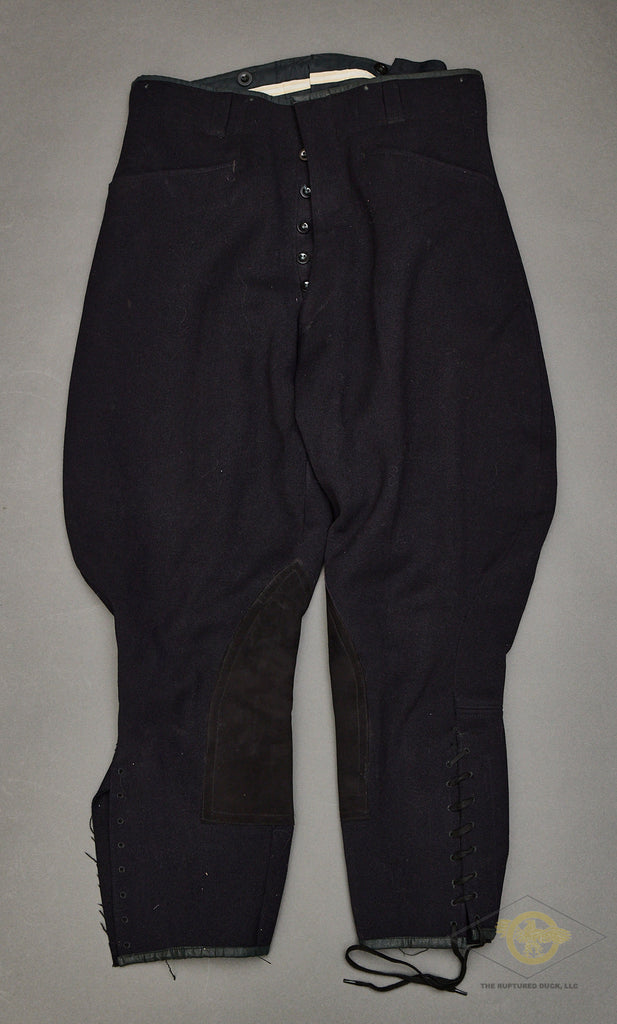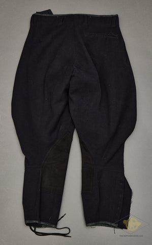 WWII German Political Style Breeches-We are not sure which specific branch these are for but they could be NSKK, HJ or SS. They are a very dark blue wool that is clean and damage free. The lower legs have tie (not present) closures. There are nearly horizontal hip pockets, a single rear pocket missing the button and an additional pocket on the right side, vertically mounted near the right hip pocket. There is a four button fly with an additional button at the waist. There are buttons for suspenders. The waist is a size 33 and these are 38” in length. Overall great condition!