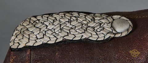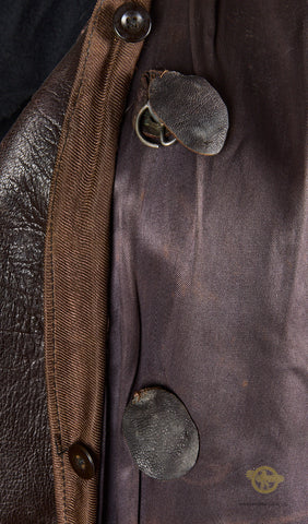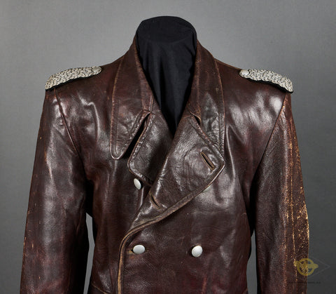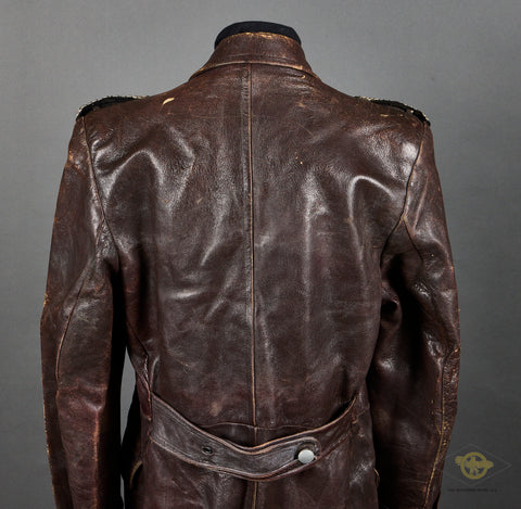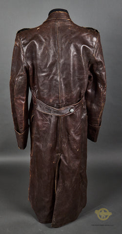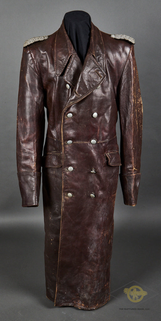 WWII German Wehrmacht Officer Leather Great Coat-This is a military officer great coat with slip on shoulder boards for a major in the RAD (most likely collector applied and easy to swap). This is a great looking brown leather coat that has minor wear and scuffing. It still remains quite soft and supple. It is double breasted with two rows of silver finished pebbled metal buttons. There are hip pockets French cuffs. This has accommodations for a zip in winter liner but none is included. There is a slot and a strap for an edged weapon. This was brought home by a sergeant who was assigned to a half track in Pattons 3rd army. We will supply the buyer with the info that we have on him. The coat is a size medium. Very nice!