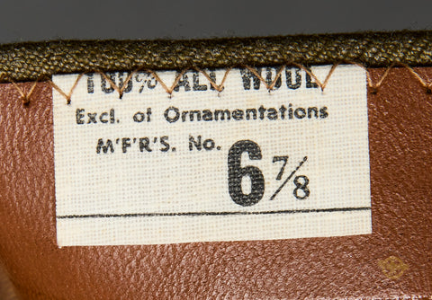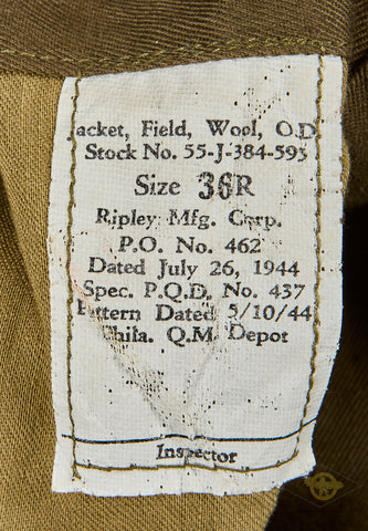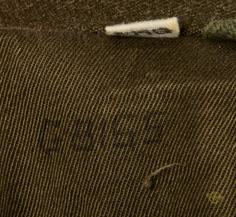 WWII US “Ike” Jacket for 26th Infantry Division Tech Sargeant-This also comes with a very nice side cap that is piped in blue for infantry personnel. This dual unit example is in fine condition overall. It is produced in a greenish shade of olive drab. It has a four button closure and all buttons are brown bakelite. There are pleated breast pockets with scalloped flaps. The left sleeve has a tech sergeant chevron and also a unit patch for the 26th Infantry Division, the Yankee Division. The left sleeve also has five stripe devices for 2 1/2 years of overseas service. The right sleeve has a U.S. Army ETO Advance, known as ADSEC (Advance Section of the Communications Zone) plus another rank chevron. There is a “Ruptured Duck” patch above the right breast pocket. There are no collar discs but you can see where they once resided. The interior is fully lined in khaki cotton. There is a pocket on each side. The right side has a tailor tag with the date July 26, 1944. The tailor is Ripley Manufacturing Co. and the size is 36R. There is a size tag in the neck as well. Great condition!