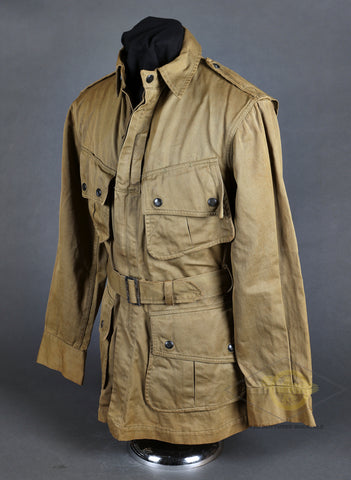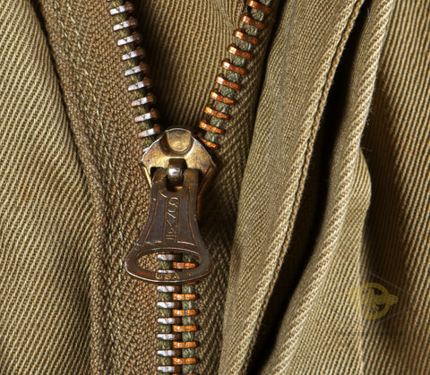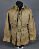 WWII US Model 1942 Jump Jacket-Extremely desirable! This is an early non reinforced example. It is produced in olive drab #3 cotton that is excellent. There is ever so minor discoloration only. It has the four patch type pockets with double buttoned snap closure flaps. There is a zippered knife/switchblade pocket at the top of the left side closure. All zippers are functioning. The main closure zipper is marked “Conmar”. The built in belt is present with its plated metal buckle in place. This was never issued or at least has never had any kind of insignia added to it. It is a size medium. These were issued to paratroop units and were supplanted by the M1943 style with reinforcements and other changes due to their fragile nature. This is a fantastic, early example!