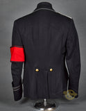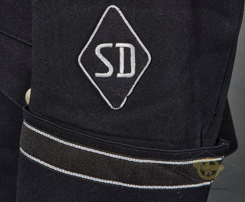 Allgemeine SS SD Officer Service Tunic and Breeches-This is for an officer, leutnant in the Wehrmacht but in this case an Untersturmführer in the Allgemeine SS. The SD is the Sicherheitsdienst, or Security Service (of the Reichsführer SS). This is a privately tailored example in black trikot wool. There is extremely minor wear and discoloration from use only. There are pleated breast pockets with scalloped flaps. The hip pockets are internal and also have scalloped flaps. There is a four buttons closure and all buttons are nickel silver finished pebbled metal. The rear tail belt buttons are pebbled metal with a gold finish (likely replaced at some point). The lay down collar is lined along the outer edge with a silver bullion twist rope piping. Both collar tabs are black badge cloth with a silver bullion twist rope piping. The right side is blank which of course is correct for SD personnel. This appears to be a tailor repurposed rank tab as there are three small holes from where there were once pips on it. The left side rank tab does have three pips for the aforementioned rank of Untersturmführer. The right side has a 1934 pattern shoulder board of silver flat wire with black badge cloth underlay. There is a 1934 pattern black cloth RZM SS tag underneath. There are loops on the left breast pocket for two awards. Just above are loops for a large size ribbon bar. These have been used as you can see in the photos. The red wool armband is hand applied with a single stitch. It is in great condition, with minor wear and discoloration only. It has a black tape stripe at the upper and lower edges. There is a separated applied white ribbed cloth disc with multi piece black tape swastika. There is an officer style cufftitle on the left side cuff. It is black which is correct and has silver flat wire piping on the upper and lower edges. Just above is a very scarce officer style SD diamond of black badge cloth with silver bullion twist rope piping and the lettering rendered in silver bullion. The interior is fully lined in black rayon that is in fine condition. There is a single pocket on the left side. There is a large tailor tag on the pocket that reads Toni Henrichs, Köln. Inside is another tailor tag with the name Herm Henning and the date Januar 1939. See below for more info from our sleuth Tom M! The tunic is a size medium and, lastly, there are metal belt hooks. The breeches are black trikot wool as well, with black tricot breeches, five-button hidden fly, slit waist pockets with buttons, watch pocket, rear pocket with button closure and scalloped flap, adjustable rear waist straps/buckles at each side, ankles with lace eyelet closure. Partially lined in striped rayon and white cotton. Adjustable blue elastic suspenders with buckles, attached by brown leather button straps. The waist is a size 36 and these are 38” in length. A scarcely found example!