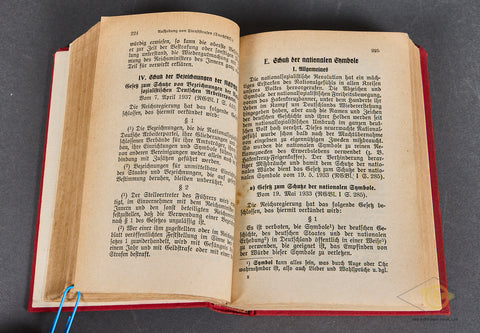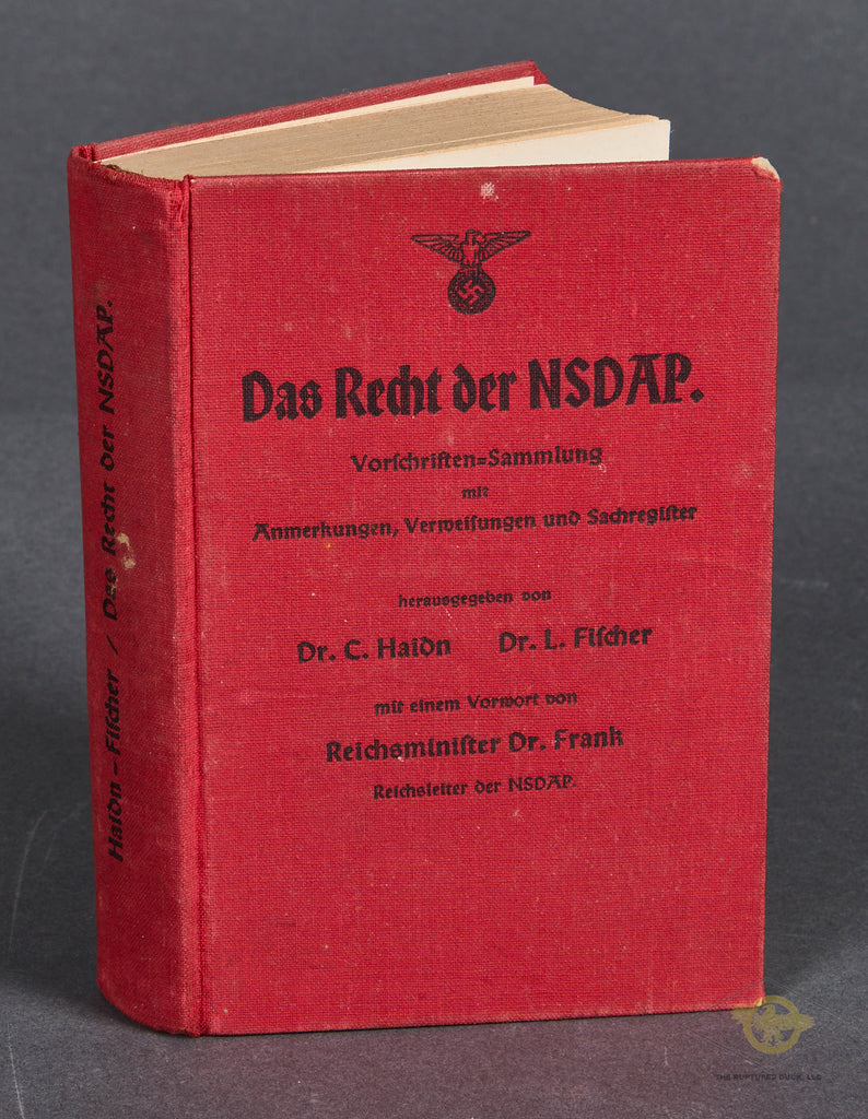 Das Recht der NSDAP: Vorschriften-Sammlung mit Anmerkungen, Verweisungen und Sachregister-This translates to The Law of the NSDAP: Collection of regulations with notes, references and subject index by Carl Haidn, Ludwig Fischer. This original book was published in 1936 and published by the Zentralverlag der NSDAP. It contains 783 pages and of course is written in German. This is a hardcover book, bound in a red linen cover. The covers are in very good condition. There is a stamp on the inside cover. The pages are clean, and the binding is tight. Overall, this book is in very good condition.