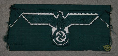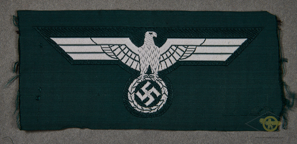 German WWII 2nd Pattern M36 Army EM Breast Eagle-This is an unissued example, with a gray eagle in BeVo on a green rayon badge cloth. This is very clean, and in very good condition.