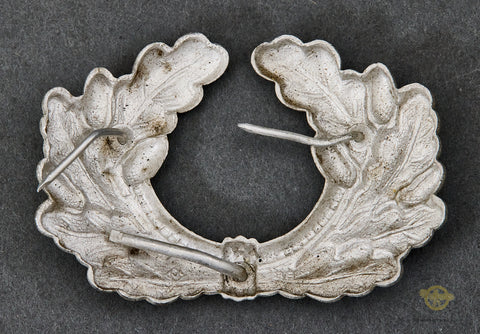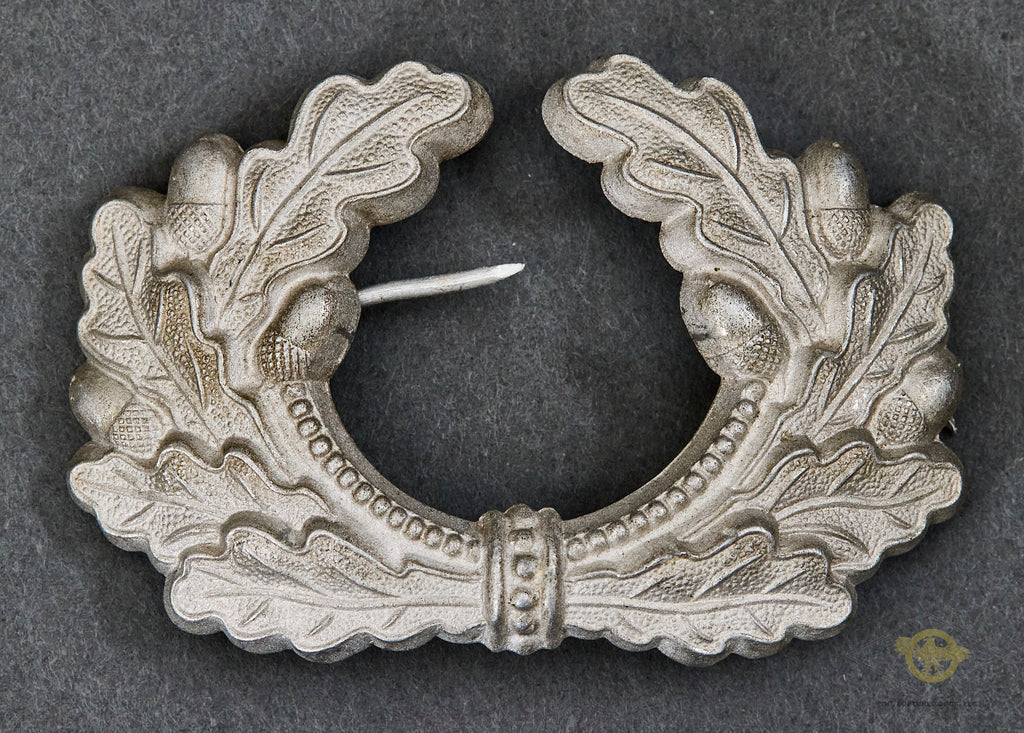 German WWII Army Visor Cap Wreath-This is an aluminum wreath, with no cockade. The aluminum remains shiny, with very good details. The prongs are in place. We have several of these and the one you receive will be as good if not better than the one photographed.