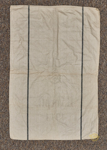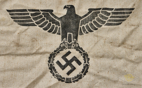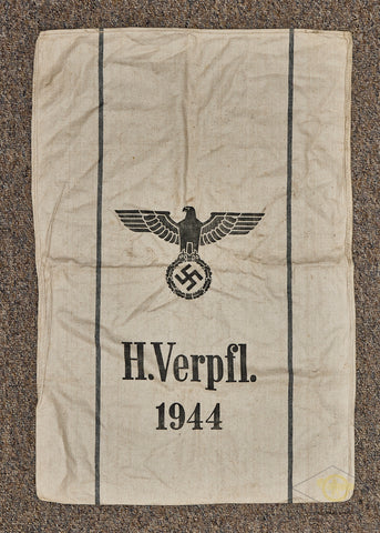 German WWII Heer Army 1944 Dated Heavy Burlap Ration Grain Sack-This heavy burlap sack is fully intact. This is the standard issue Heer ration grain sack, which measures approx. 41 inches (104.14 cm) high, and 28 inches (71cm) wide. A steady supply of food was of utmost importance to any fighting force, and these sacks were the preferred way of transporting grain. This bag has a large stenciled Wehrmachtadler (Armed forces eagle), over a stencil, identifying the maker. On the reverse is a stamp with H. Verpfl. 1944. The initials are for Heeres Verpflegung, or "Army Rations". There is some discoloration. This bag presents very well. Overall, an interesting collectible.