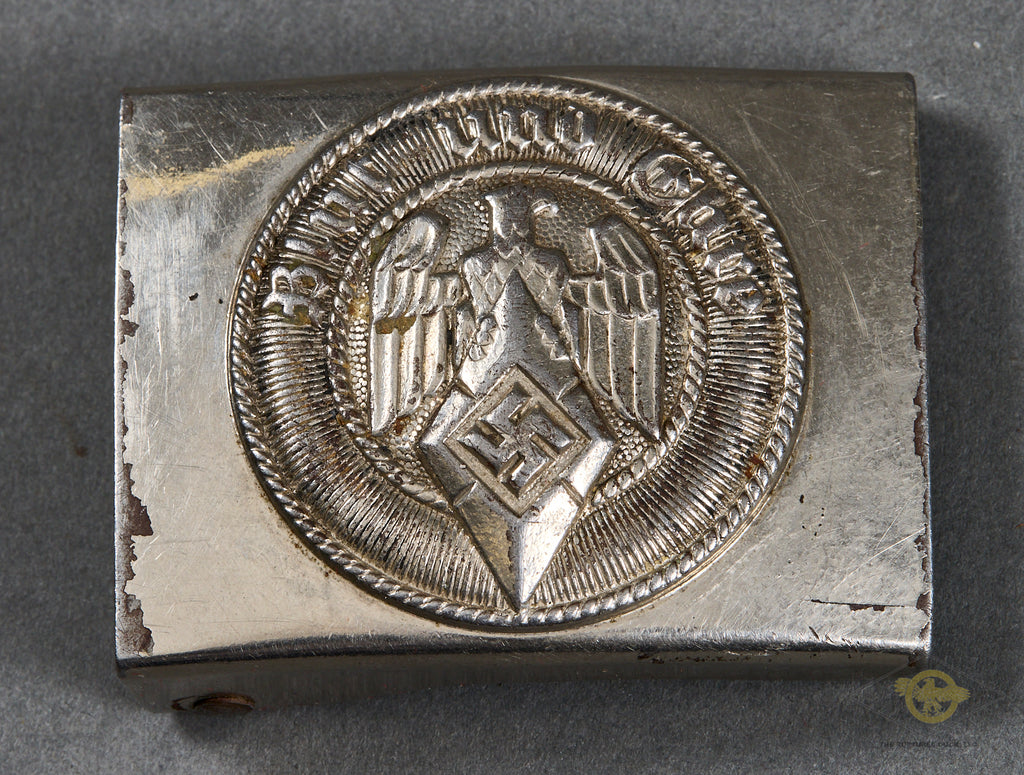 German WWII Hitler Youth Buckle-This is a stamped, one piece, nickel silver steel HJ buckle. The reverse is nicely maker marked with RZM M4/28 for Paulmann & Crone of Lüdenscheid. It shows some wear, but the details are still good. There is some verdigris on the obverse, but this is very slight. The steel catch and roll bar are in place. This buckle is in very good condition!