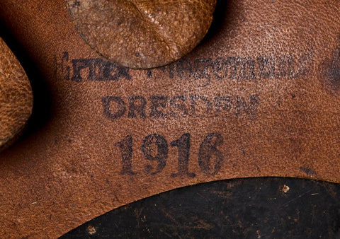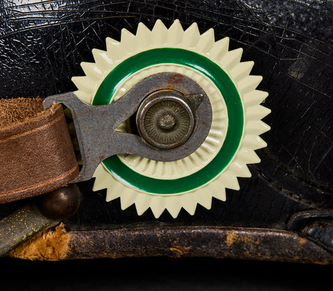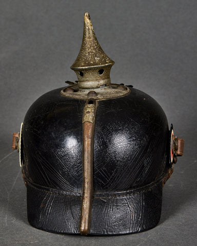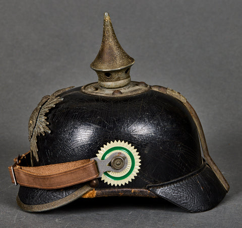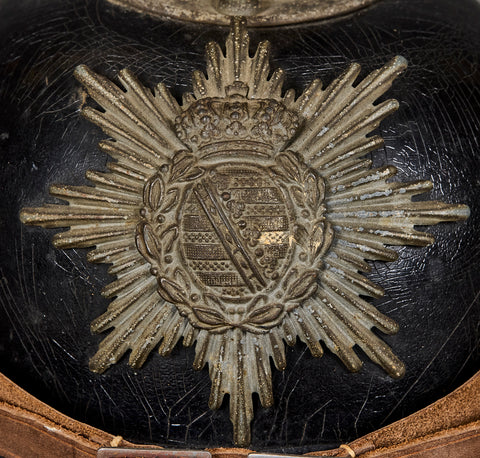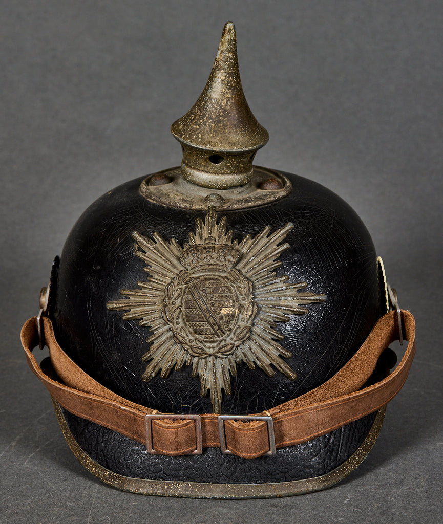 German WWII Imperial Spike Helmet-This is an interesting spiked helmet. This helmet is dated 1916, and that is the year that the Pickelhaube was discontinued. The spike on these type of helmets became a liability. Not only was it causing damage to horses, but these leather helmets offered little protection against shell fragments and shrapnel. The conspicuous spike made its wearer a target. The men were ordered to remove their spikes when they were on the frontline. This is the latest model, as 1916 was the year that this style was slowly replaced by the steel stahlhelm we are all so familiar with. This helmet is made of dark brown boiled leather. It has some minor crazing and fading but is in overall very nice condition. The spike, Prussian frontal plate, spike base, spine and visor trim are made of steel as per regulation. These have lost all of their original finish but still display nice detailing, and a dark gray tone. The plate shows the crest for Saxony or as it was known then, Sachsen. The spike comes off with ease. The black leather chinstrap and two side cockades are both POST WAR REPROS included for free. The interior has a leather liner that is in very good condition, though it does show slight wear and discoloration. It is intact. There is a makers stamp inside, and the date of 1916. This is a size 55. A great looking spiked helmet!