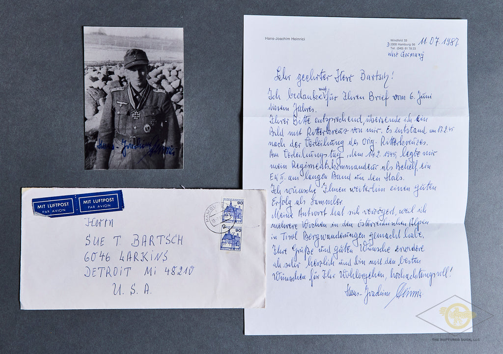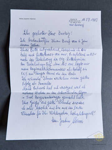 The photo is in good condition; it is signed by Heinrici in blue ink. There is a letter dated 1987 included, also signed by him.  The photo measures 5 inches (12.7cm) long by 3 ½ inches (8.89cm) wide. Again, this is in good condition, though it is a darker photo.